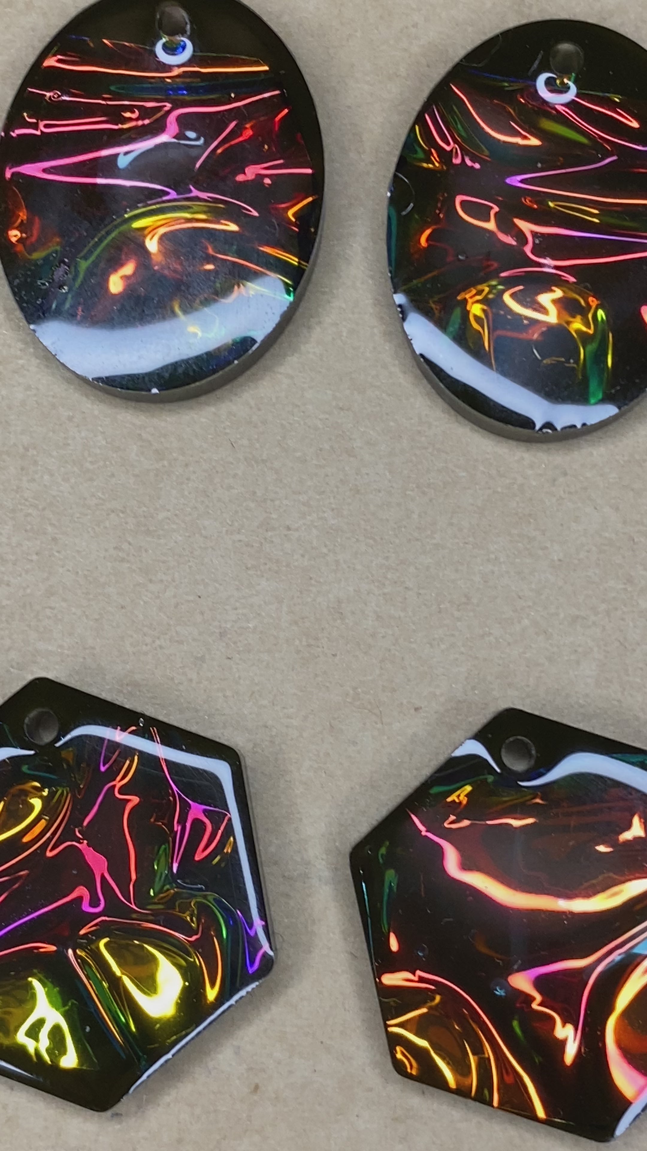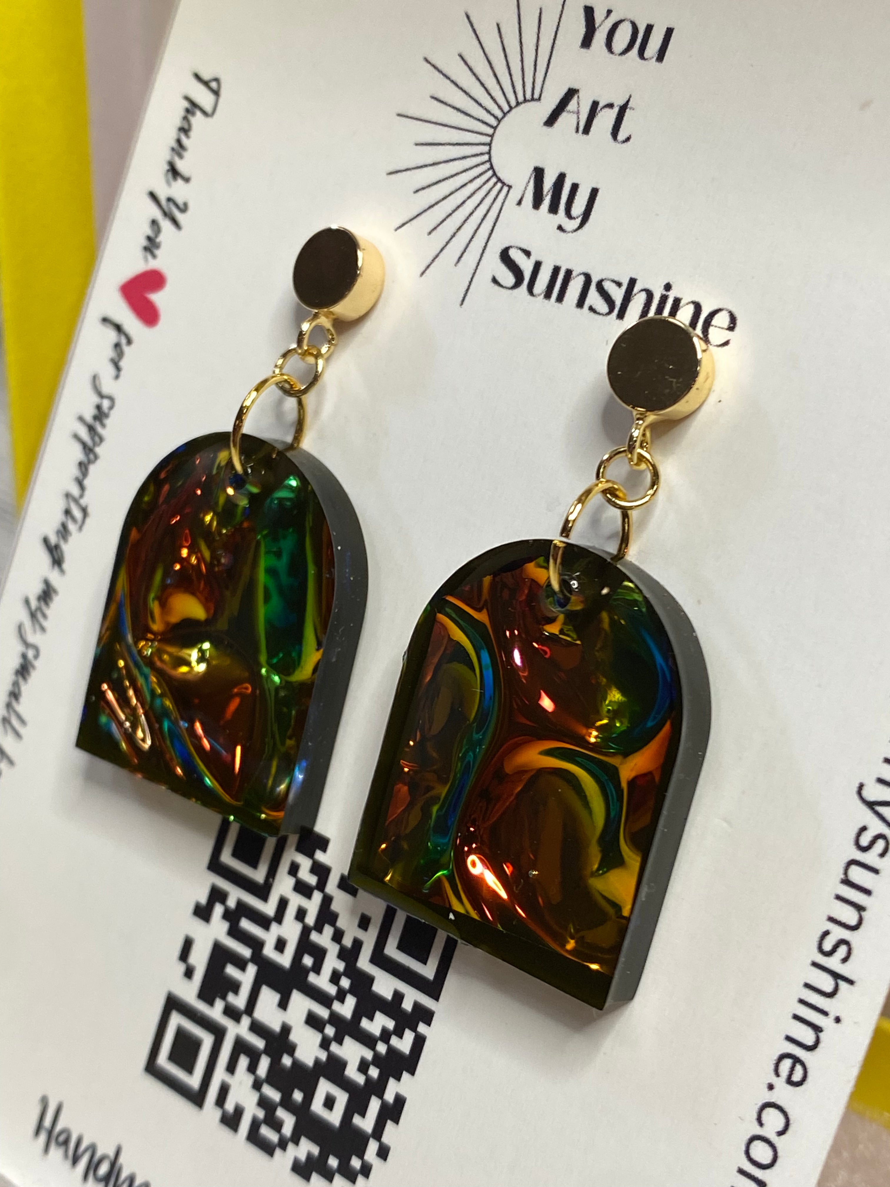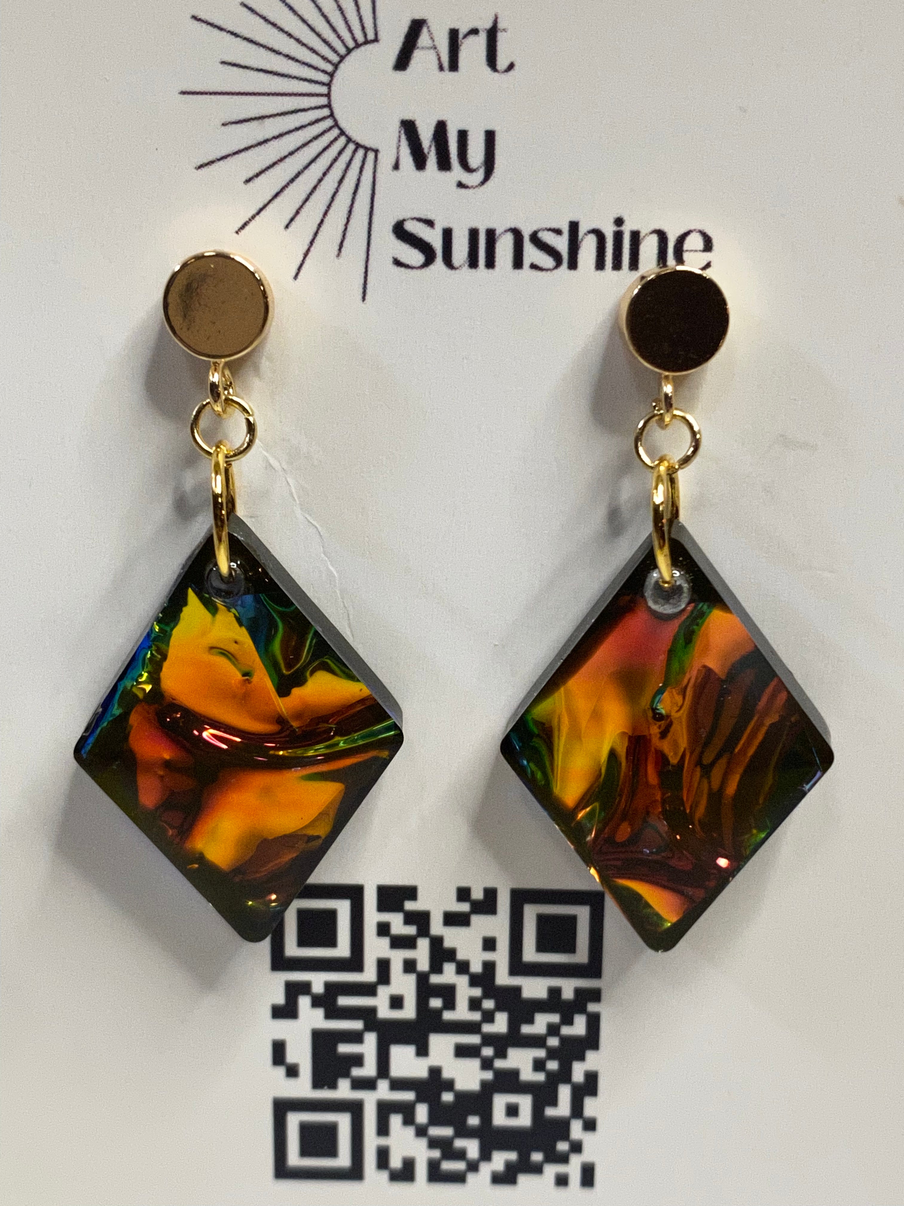 Introducing the spectacular Opal Fire earrings – handmade with unique resin art and 18k gold plated studs, they are the perfect addition to any jewelry collection. These remarkable earrings feature an eye-catching display of colors shining with opal fire, sure to catch everyone's attention. Available in a variety of shapes, these earrings will add the perfect finishing touch to any outfit. Make a fashion statement today and order the Opal Fire earrings!