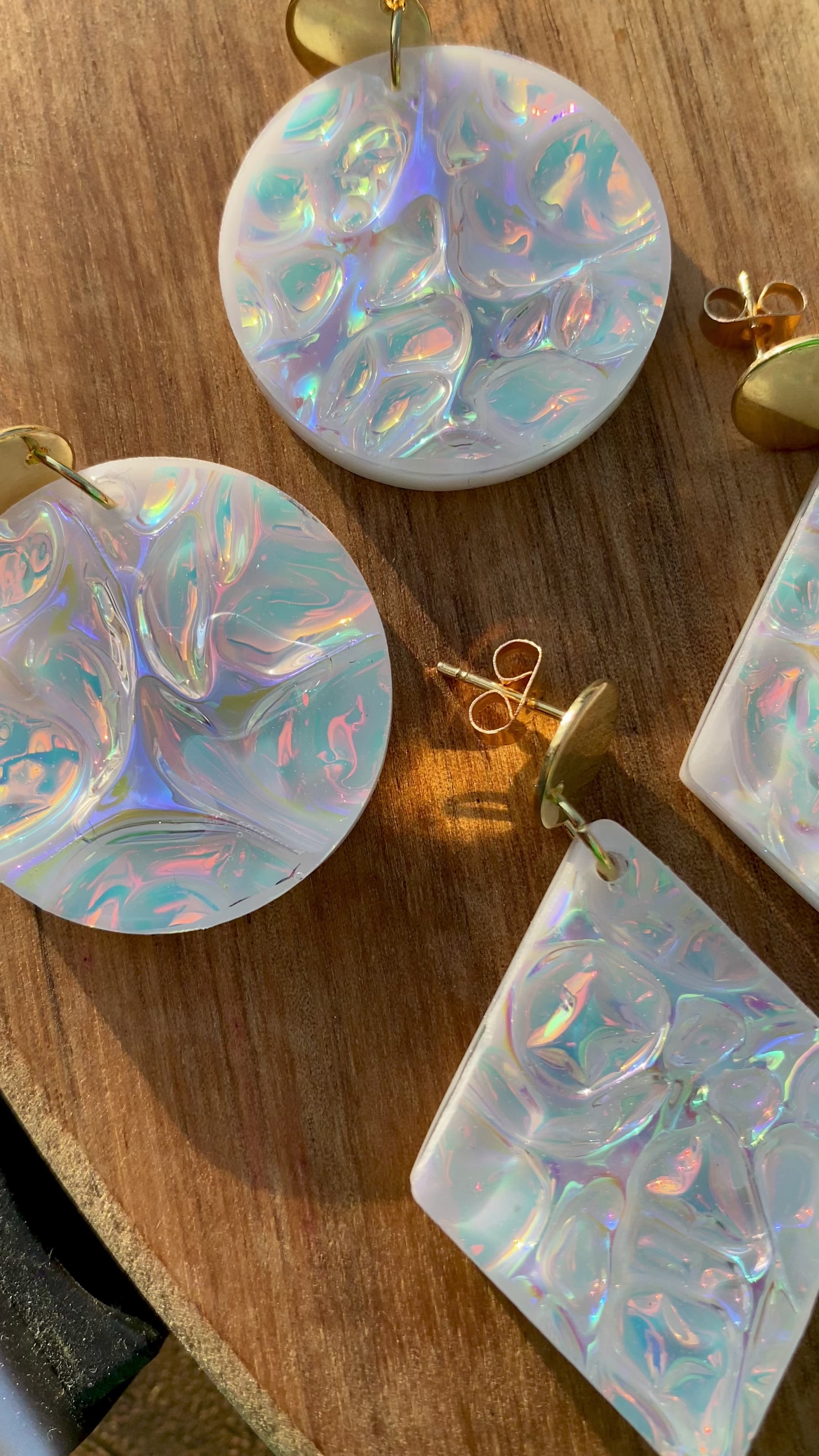 Note: Each piece is one of a kind and no two pair of earrings will look exactly alike. (example: slight variation of color or more glitter) Micro bubbles may be present and do not take away from the beauty of the resin pieces. Although we use high quality resin with UV resistance, all resin ambers over time (turns yellow).